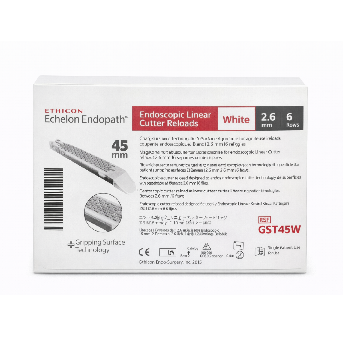 El Cartucho Ethicon ECHELON ENDOPATH™ de 45 mm con tecnología Gripping Surface Technology (GST), color blanco y carga regular/thick, diseñado para su uso con grapadora powered en procedimientos quirúrgicos. Su diseño favorece un manejo preciso y un desempeño confiable en entorno hospitalario.